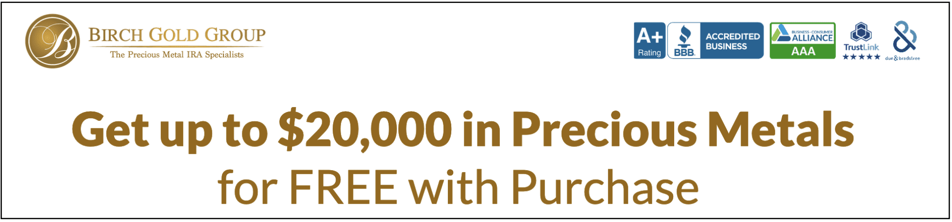 | Birch Gold Group | A+ | 5 Star Rating | $10,000 | Great - Up to $20K in Free Precious Metals |